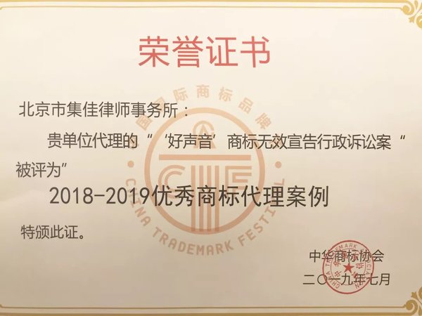 >必发>关于我们>荣誉概览>2019>集佳代理“好声音”商标无效宣告行政案入选“优秀商标代理案例”