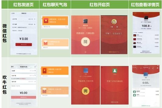腾讯公司主张“吹牛”软件中提供红包收发服务,在红包发送接收全过程中所使用的红包发送页、聊天气泡、开启页、查看详情页等界面全面抄袭、模仿腾讯公司“微信红包”相关界面。此外“吹牛”软件中还使用与“微信”软件底部界面“聊天、通讯录、发现、我”图标高度近似的图标等。上述行为涉嫌侵犯腾讯公司相关作品著作权,并构成不正当竞争。