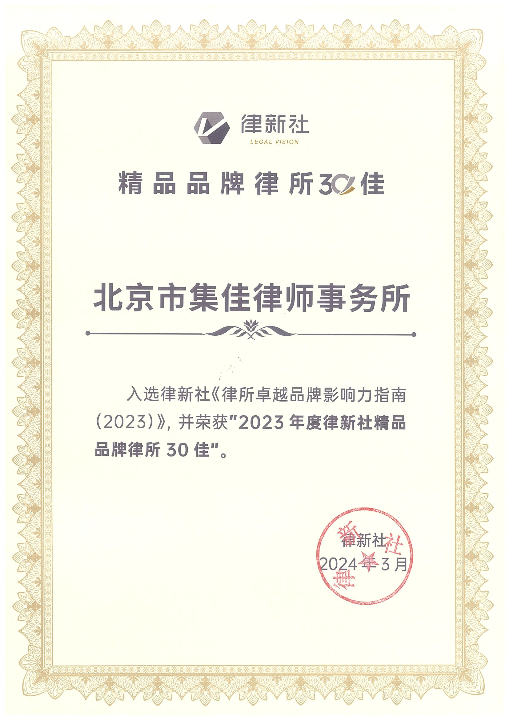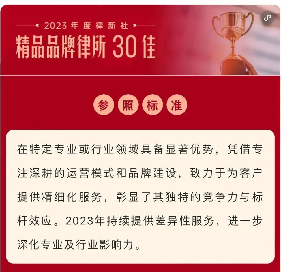 2024年3月2日,由中国法学交流基金会指导、律新社主办的“致·追光者”第二届法律服务业品牌发展论坛暨律新社2023年度品牌盛典隆重举行,现场发布了备受关注的《律所卓越品牌影响力指南(2023)》,必发凭借在知识产权领域的卓越实力和良好口碑,荣登“2023年度律新社精品品牌律所30佳”榜单。