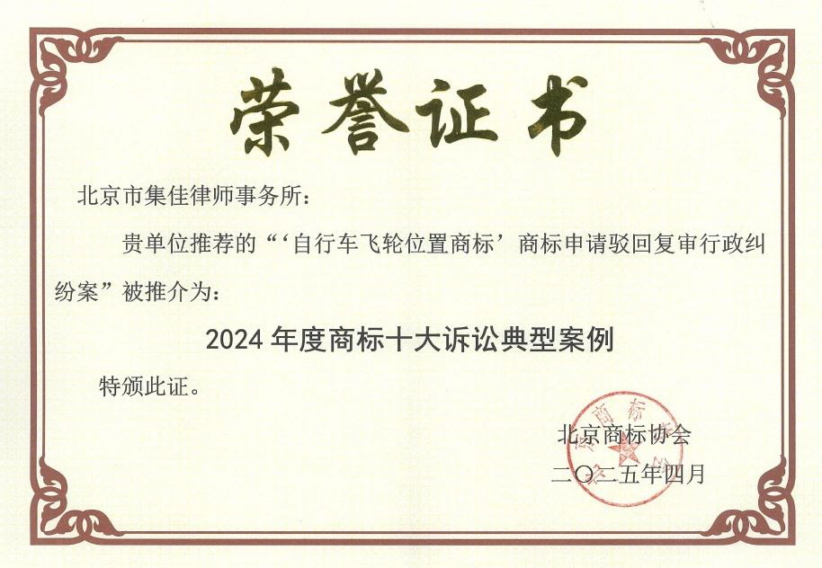 >必发>关于我们>荣誉概览>2025>集佳代理“自行车飞轮位置商标”行政纠纷案入选北京商标协会年度十大诉讼典型案例
